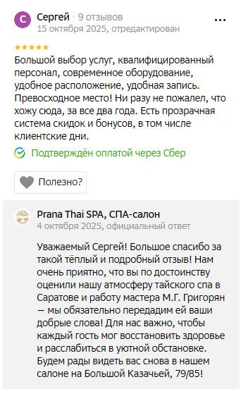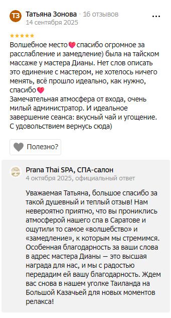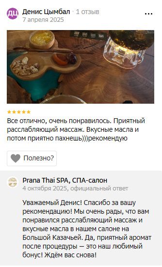 Была на часовом балийском массаже, мастер Русми. Приятная милейшая девушка, не смотря на то, что с виду такая маленькая и хрупкая, руки очень сильные, промяла спину идеально. Всё в меру. Я очень довольна. Перед массажем взяла распаривание в кадровой бочке, после массажа была чайная церемония с мёдом и орешками. В целом в Прана Тай понравилось, приятная атмосфера, музыка, хорошо встретили, всё рассказали. Отдельный плюс — огромный выбор масел для массажа, аромат на любой вкус. Мне понравился зелёный чай (на одежде никаких следов, от кожи после приятный еле уловимый аромат). Обязательно вернусь сама и порадую близких. Спасибо.